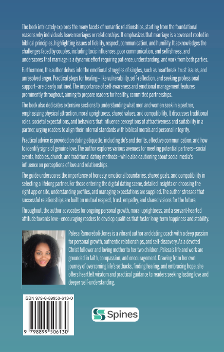 Palesa Ramoreboli-Jones is a vibrant author and dating coach with a deep passion for personal growth, authentic relationships, and self-discovery. As a devoted Christ follower and loving mother to her two children, Palesa’s life and work are grounded in faith, compassion, and encouragement. Drawing from her own journey of overcoming life’s setbacks, finding healing, and embracing hope, she offers heartfelt wisdom and practical guidance to readers seeking lasting love and deeper self-understanding.