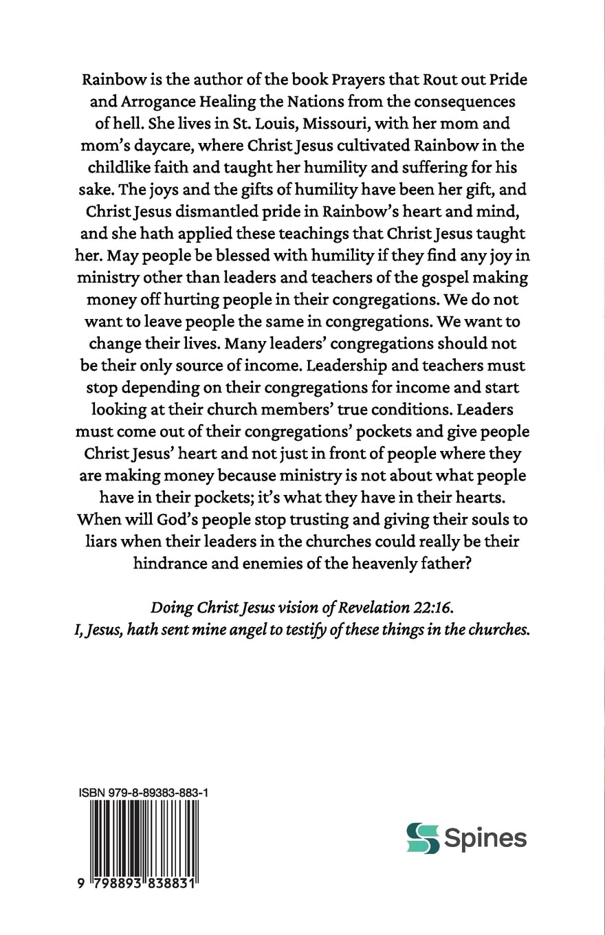 Rainbow is the author of the book Prayers that Rout out Pride and Arrogance Healing the Nations from the consequences of hell. She lives in St. Louis, Missouri, with her mom and mom’s daycare, where Christ Jesus cultivated Rainbow in the childlike faith and taught her humility and suffering for his sake. The joys and the gifts of humility have been her gift, and Christ Jesus dismantled pride in Rainbow’s heart and mind, and she hath applied these teachings that Christ Jesus taught her. May people be blessed with humility if they find any joy in ministry other than leaders and teachers of the gospel making money off hurting people in their congregations. We do not want to leave people the same in congregations. We want to change their lives. Many leaders’ congregations should not be their only source of income. Leadership and teachers must stop depending on their congregations for income and start looking at their church members’ true conditions. Leaders must come out of their congregations’ pockets and give people Christ Jesus’ heart and not just in front of people where they are making money because ministry is not about what people have in their pockets; it’s what they have in their hearts. When will God’s people stop trusting and giving their souls to liars when their leaders in the churches could really be their hindrance and enemies of the heavenly father?