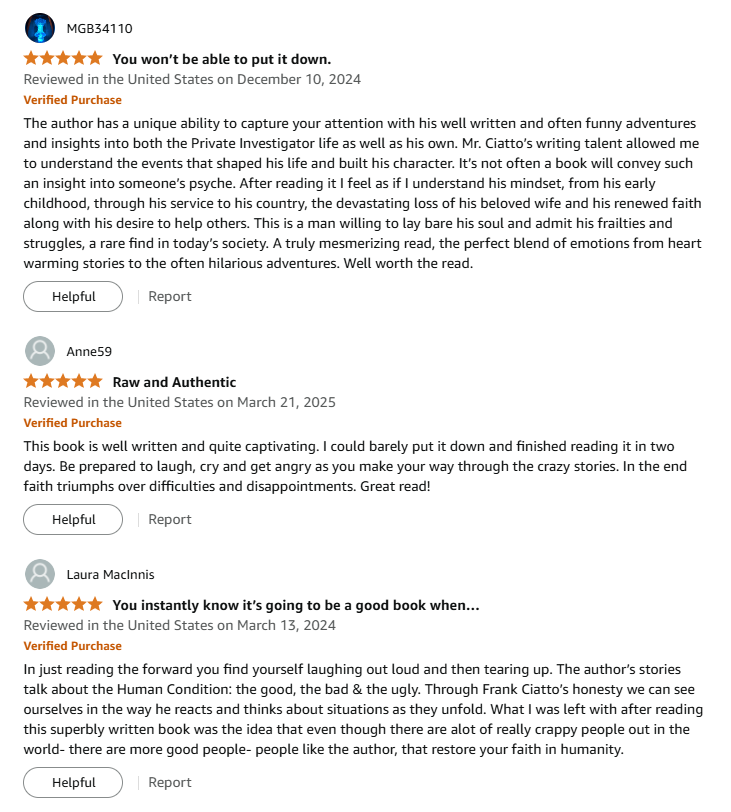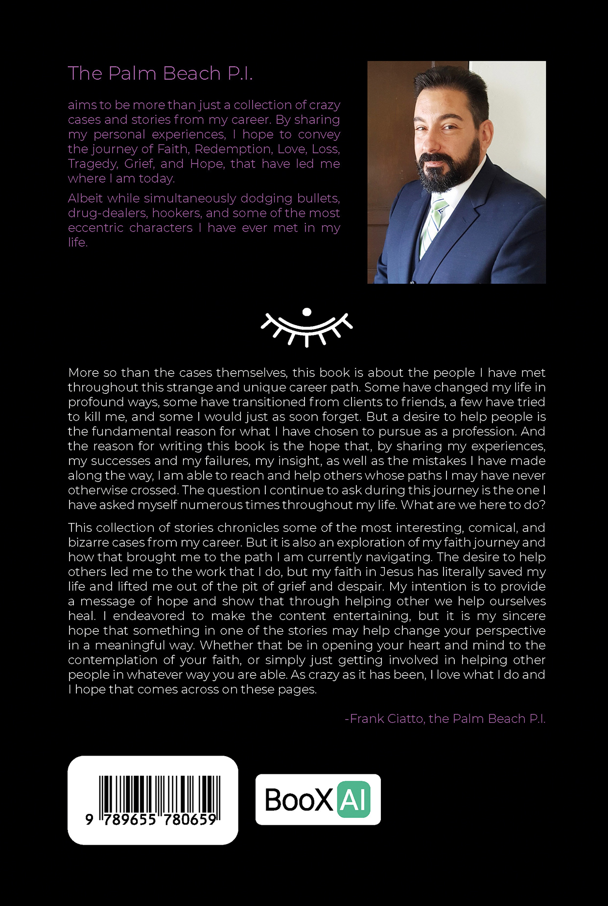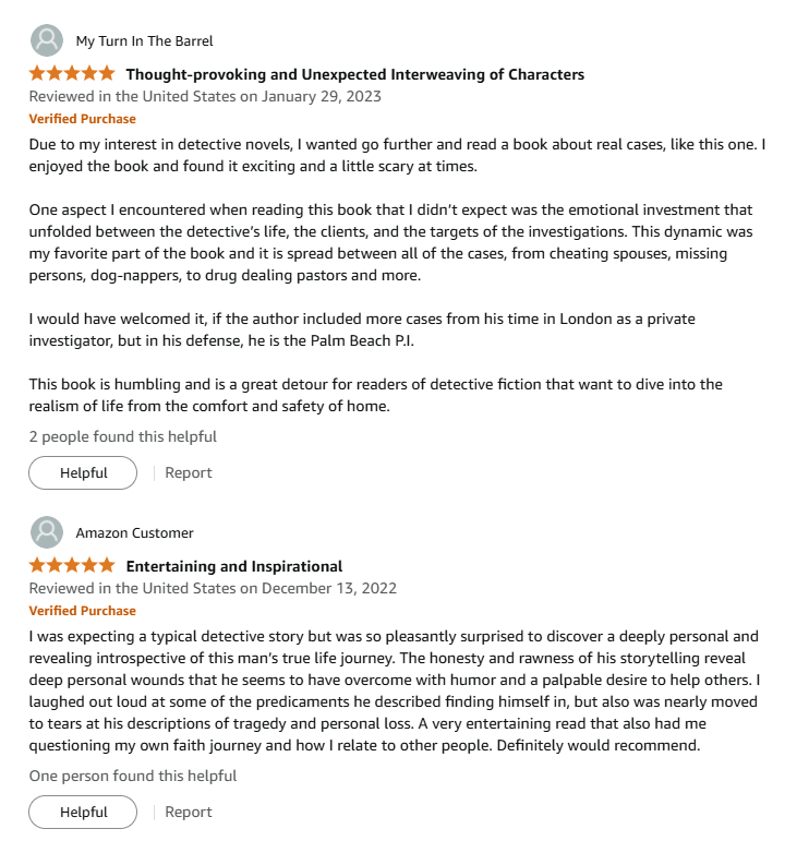 The Palm Beach P.I. aims to be more than just a collection of crazy cases and stories from my career. By sharing my personal experiences, I hope to convey the journey of Faith, Redemption, Love, Loss, Tragedy, Grief, and Hope, that have led me where I am today.